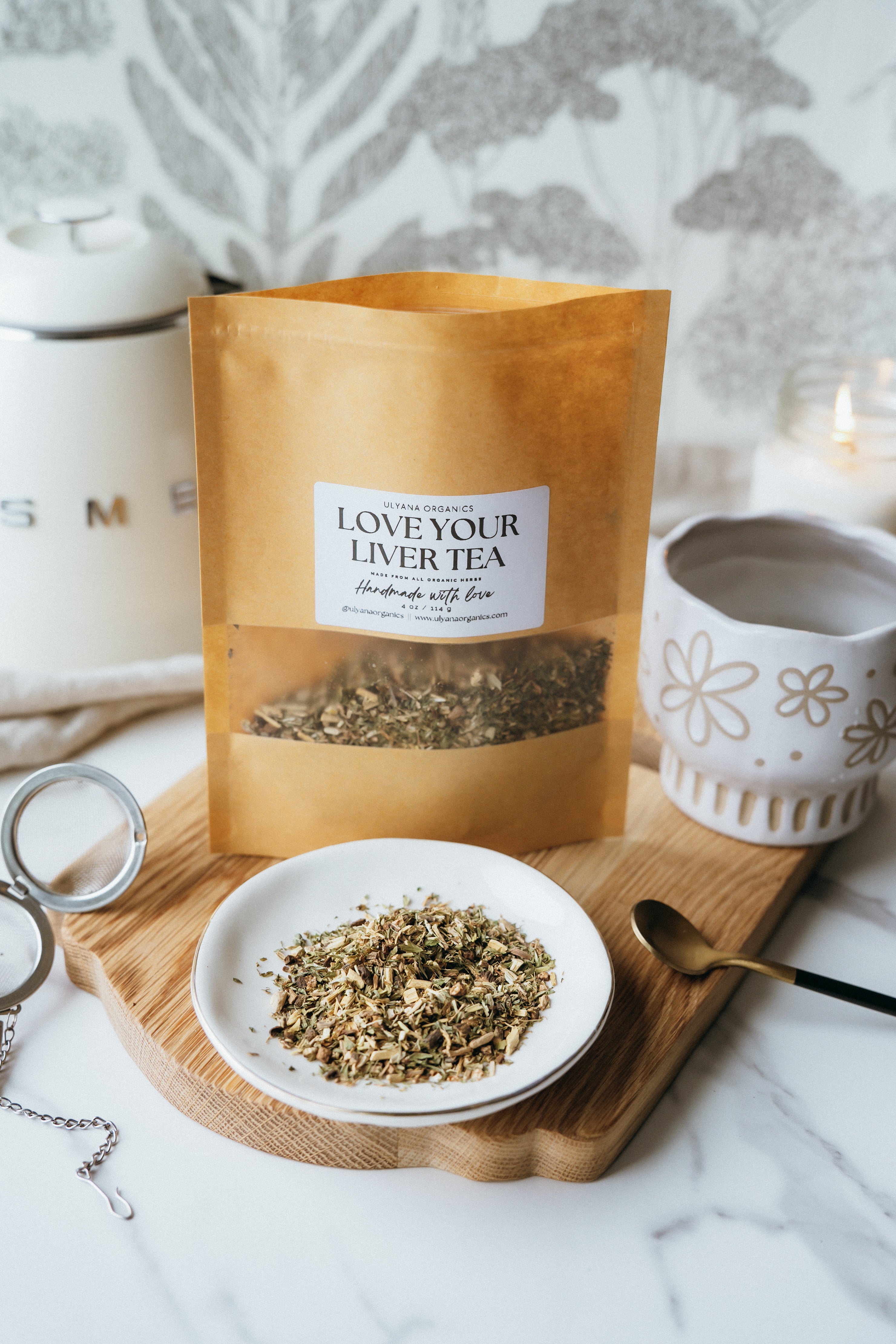 Love Your Liver Herbal Blend – A detoxifying liver-support tea made with milk thistle, dandelion root, and burdock to help balance hormones, reduce PMS symptoms, and promote overall well-being.