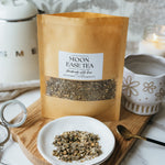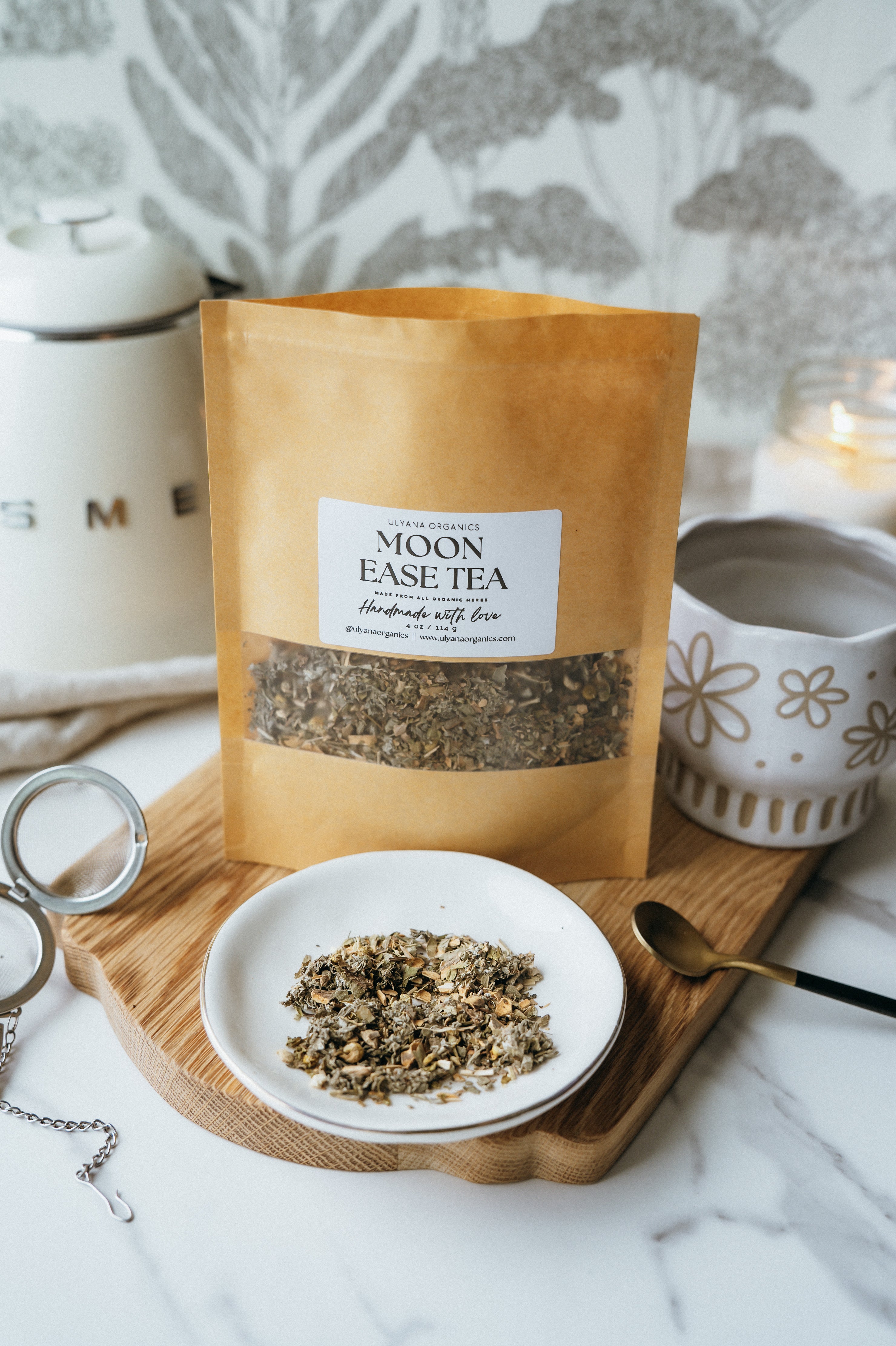 Moon Ease Period Relief Herbal Blend – A comforting, cramp-relieving herbal tea featuring raspberry leaf, cramp bark, and ginger to soothe menstrual pain, reduce bloating, and support a healthy cycle.