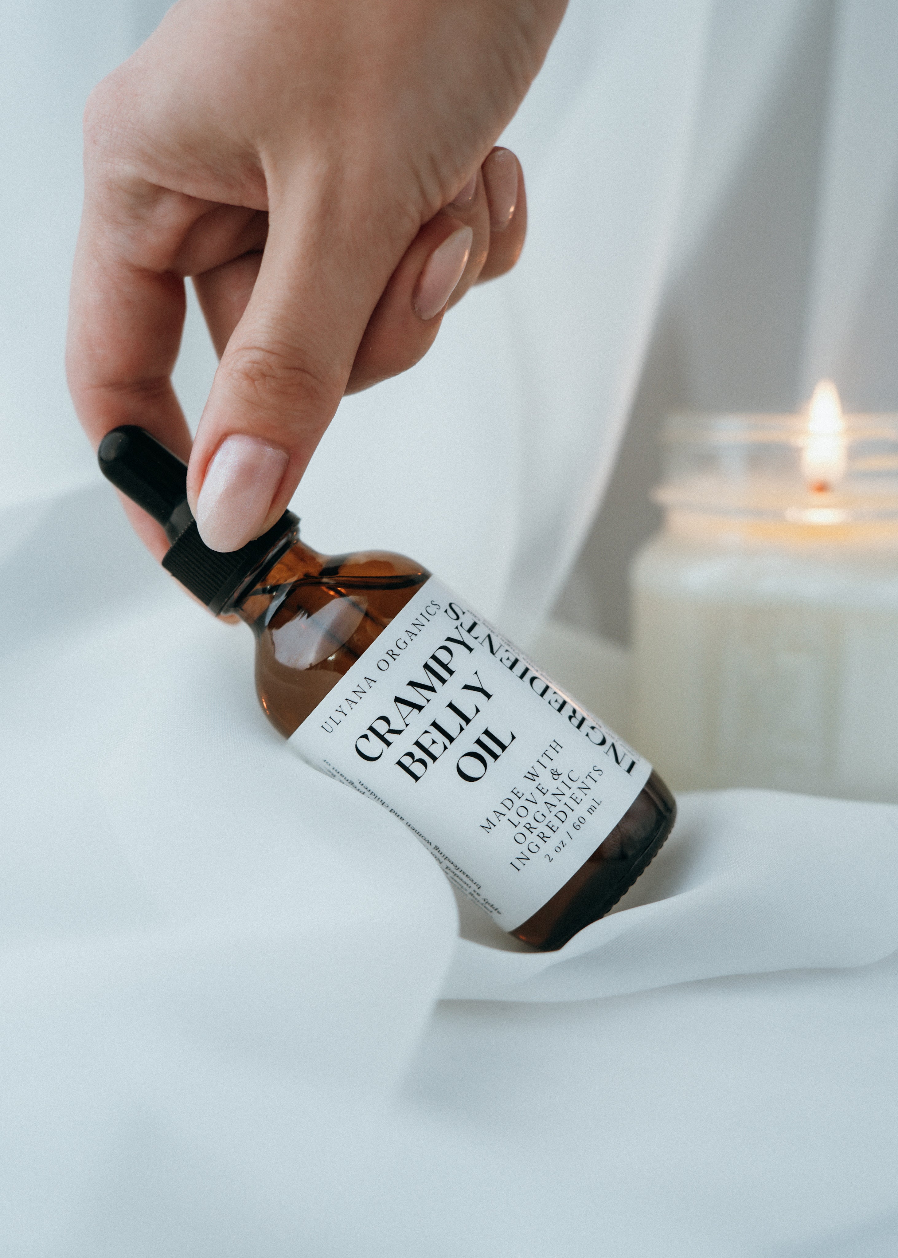 Crampy Belly Oil – A soothing, warming massage oil infused with castor oil, mugwort, and chamomile to relieve cramps, support digestion, and relax abdominal muscles.